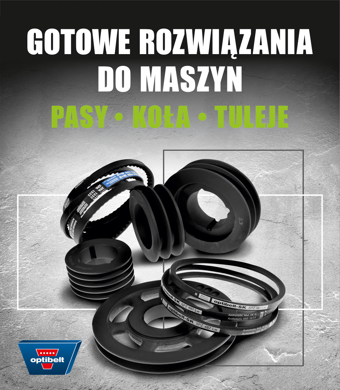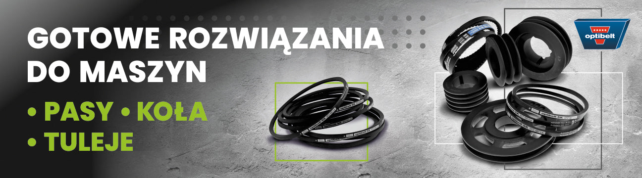 - Elementy budowy maszyn – koła pasowe, pasy klinowe, łożyska i inne niezawodne komponenty techniczne.