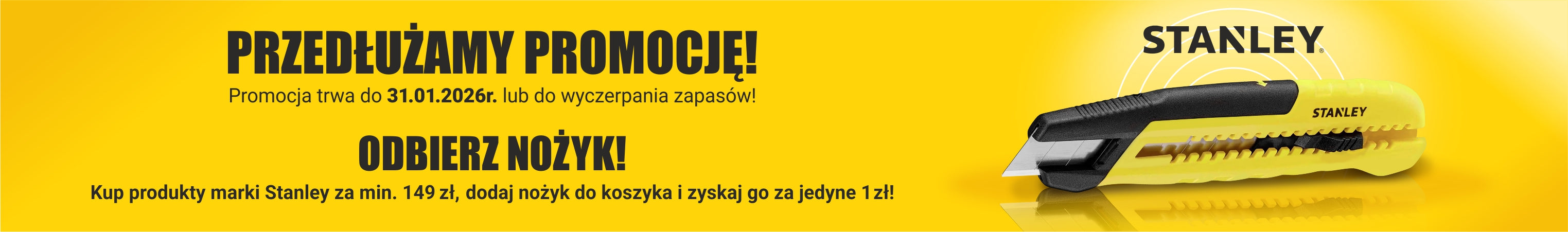 Kup produkty marki Stanley o wartości co najmniej 149 zł i zyskaj składany nóż Stanley za jedyne 1 zł! To idealna okazja, by uzupełnić swoje narzędzia o solidne i trwałe sprzęty – a przy okazji zdobyć praktyczny nóż od renomowanej marki.